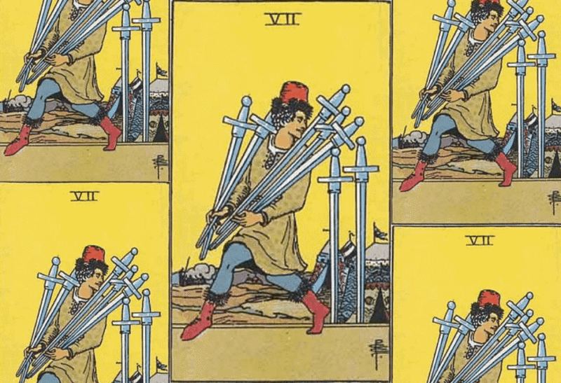 In the traditional tarot deck, the figure in the Seven of Swords walks away with stolen swords while looking back cautiously. This visual detail captures both victory and unease. The scene shows a person trying to outsmart others while fearing exposure. The colors, posture, and motion portray an internal battle between mind and morality. It reminds readers that wisdom without ethics can become manipulation. Tarot readers interpret this card as a mirror to self-reflection and accountability.